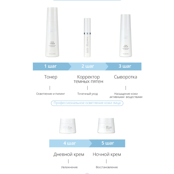 Атоми Абсолют Сноу представляет собой 8 ступеней к осветлению кожи, включающих в себя: